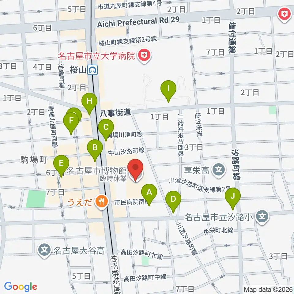 名古屋市博物館周辺のカフェ一覧地図