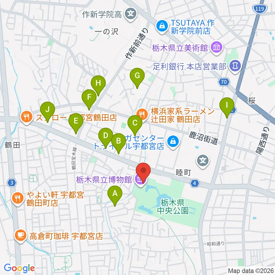 栃木県立博物館周辺のカフェ一覧地図