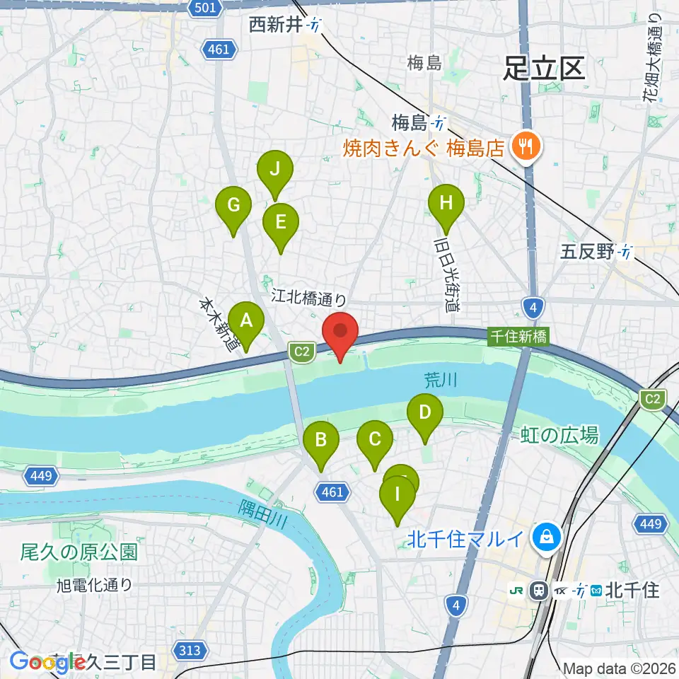 西新井橋緑地球技場周辺のカフェ一覧地図