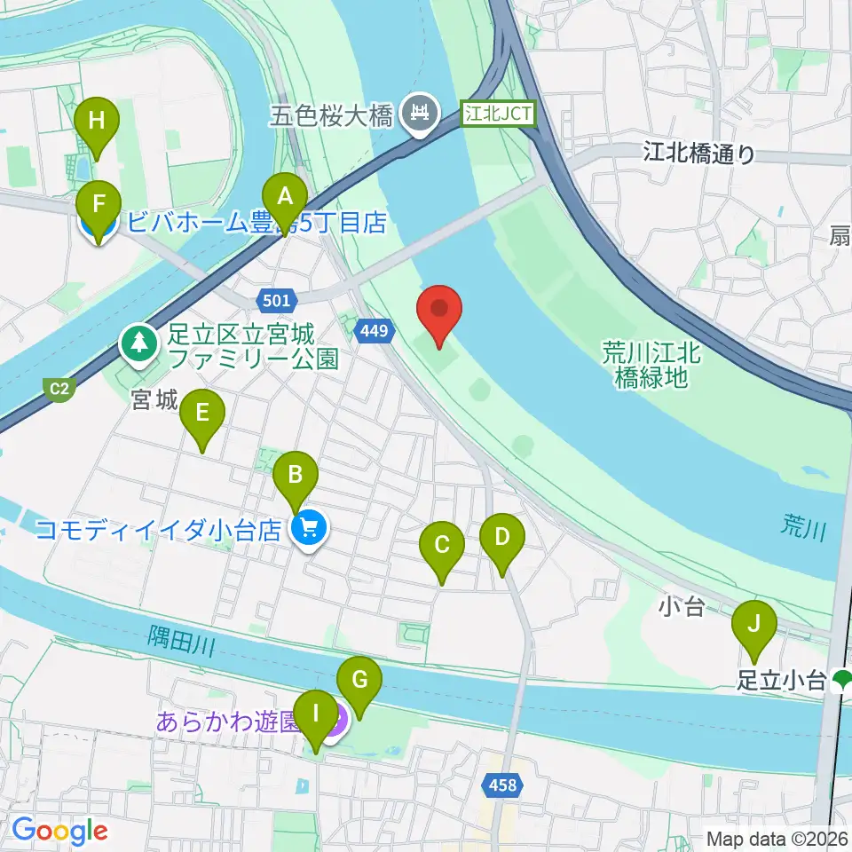 江北橋緑地右岸球技場周辺のカフェ一覧地図