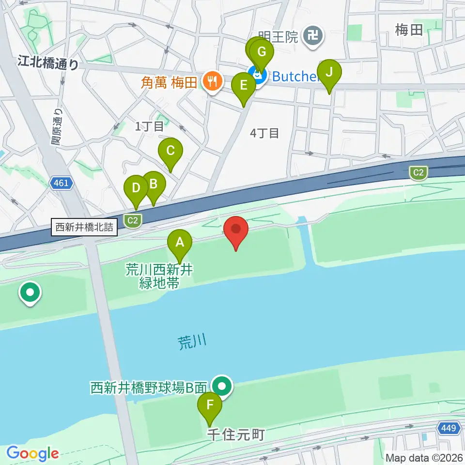 西新井橋緑地球技場周辺の駐車場・コインパーキング一覧地図