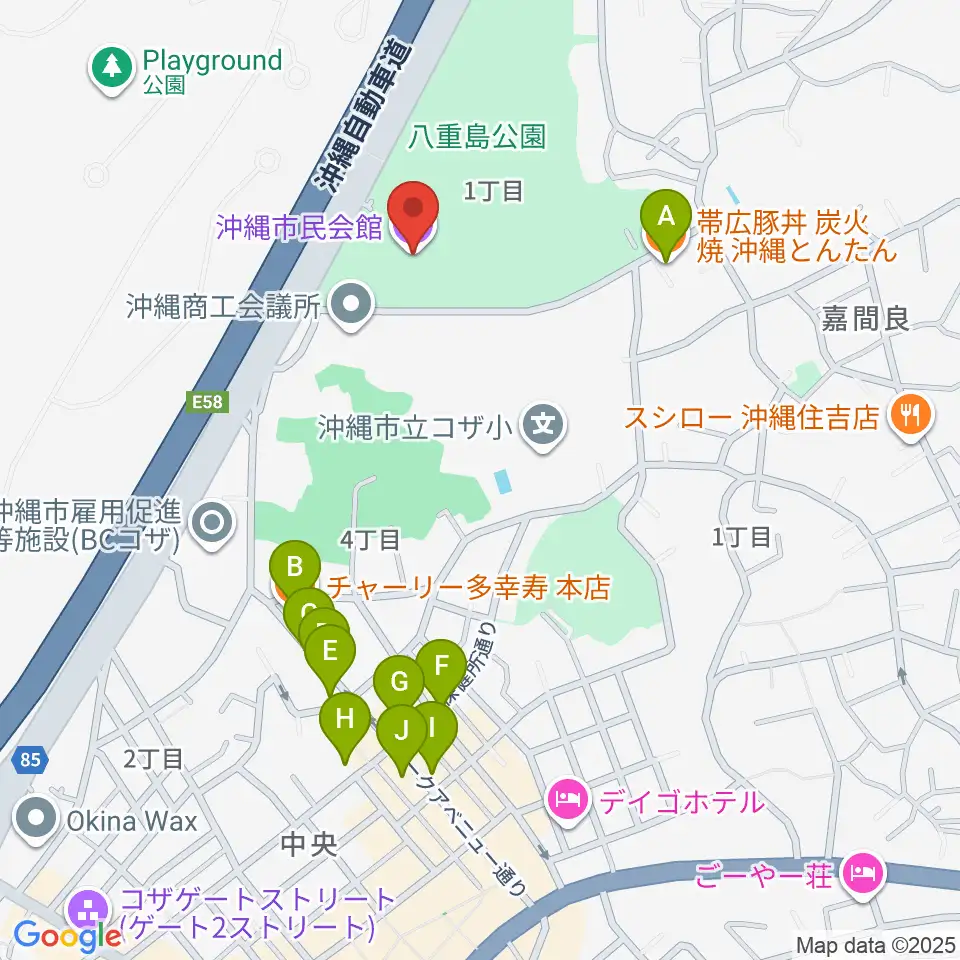 沖縄市民会館周辺のファミレス・ファーストフード一覧地図