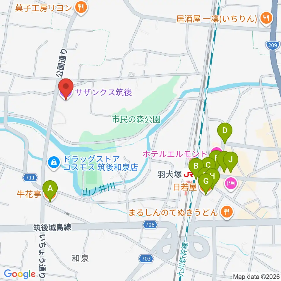 サザンクス筑後周辺のファミレス・ファーストフード一覧地図