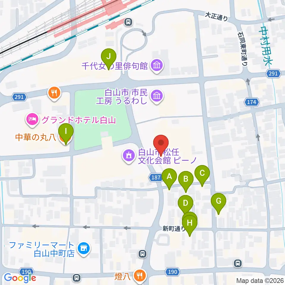 白山市松任学習センタープララ周辺のファミレス・ファーストフード一覧地図