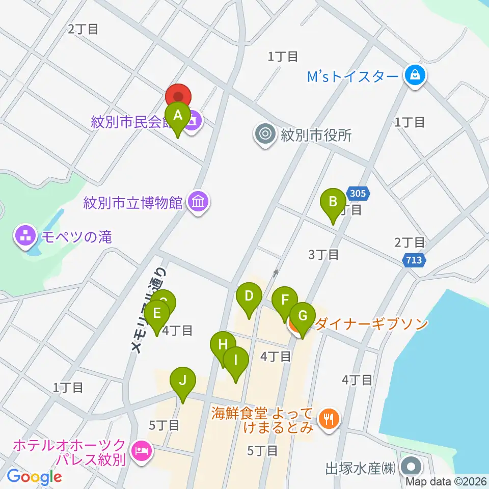 紋別市民会館周辺のファミレス・ファーストフード一覧地図