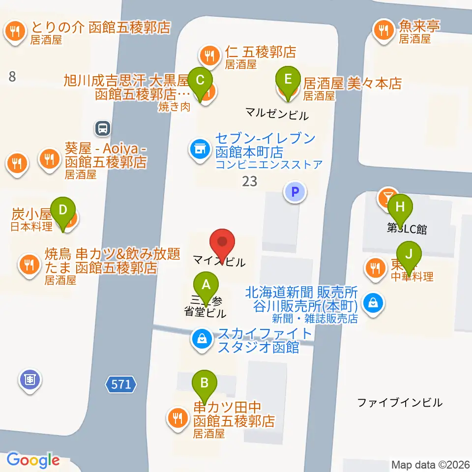 五稜郭センター ヤマハミュージック周辺のファミレス・ファーストフード一覧地図