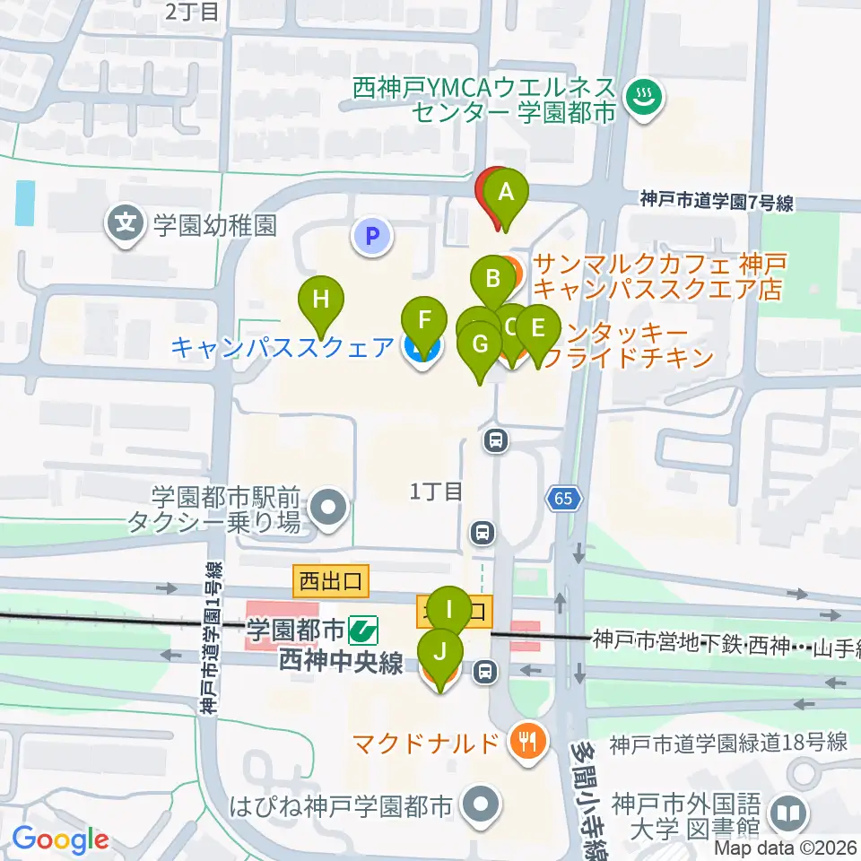 学園都市センター ヤマハミュージック周辺のファミレス・ファーストフード一覧地図