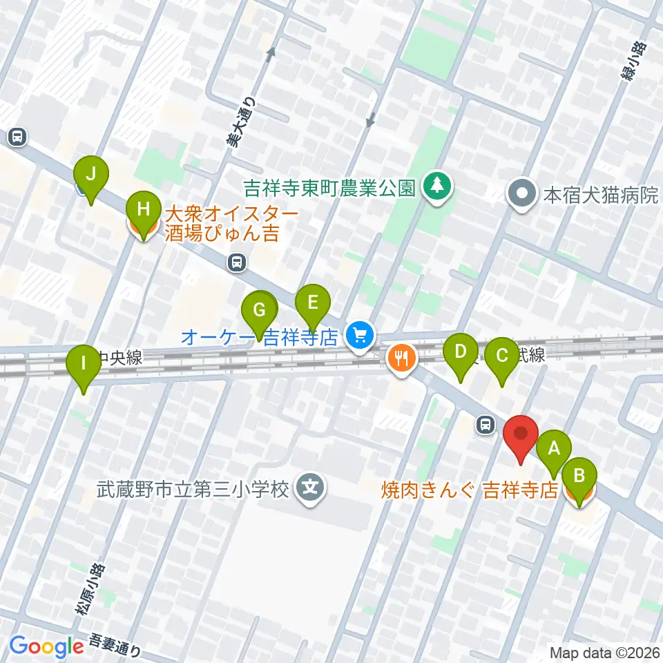 吉祥寺櫂スタジオ周辺のファミレス・ファーストフード一覧地図