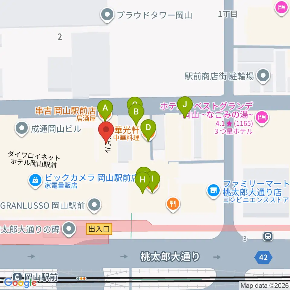 シアーミュージック 岡山校周辺のファミレス・ファーストフード一覧地図