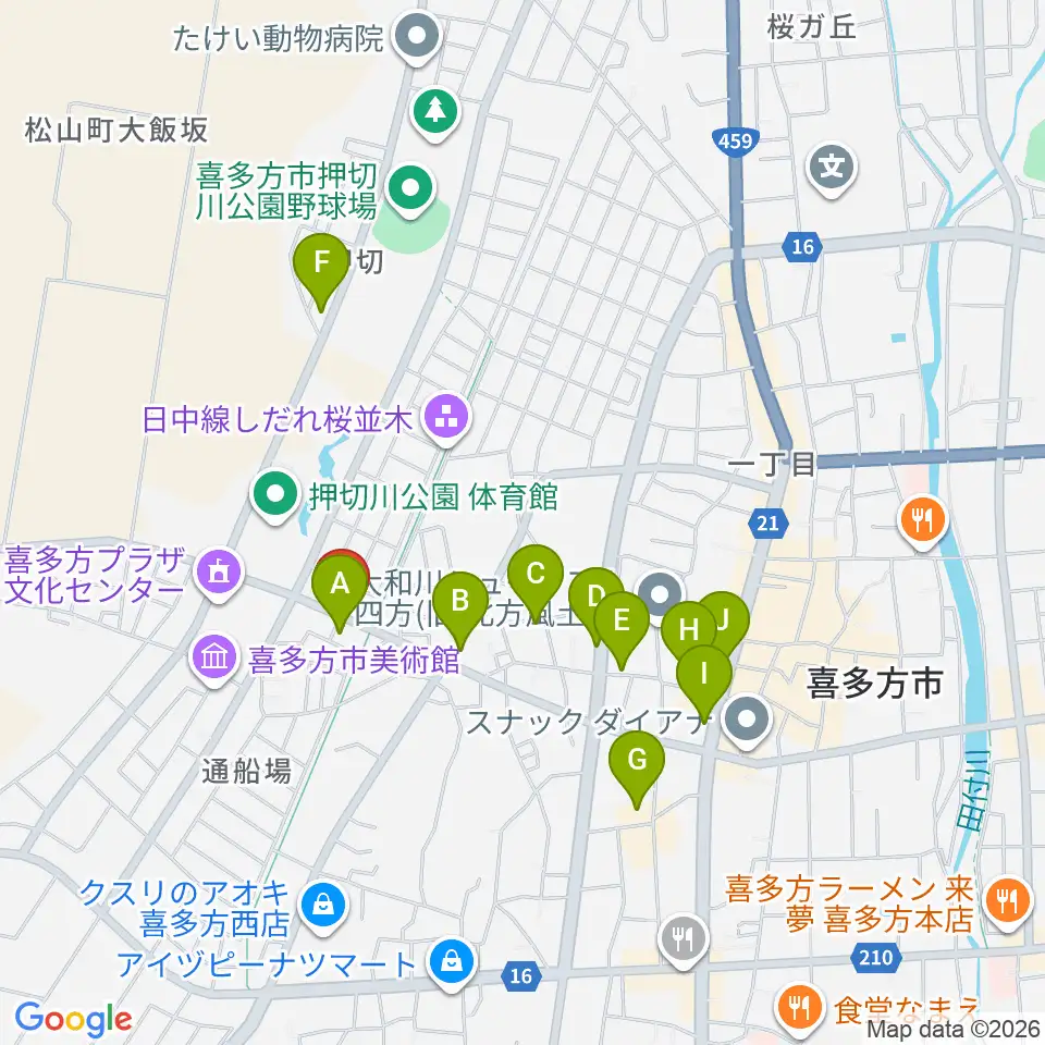 喜多方シティエフエム周辺のファミレス・ファーストフード一覧地図