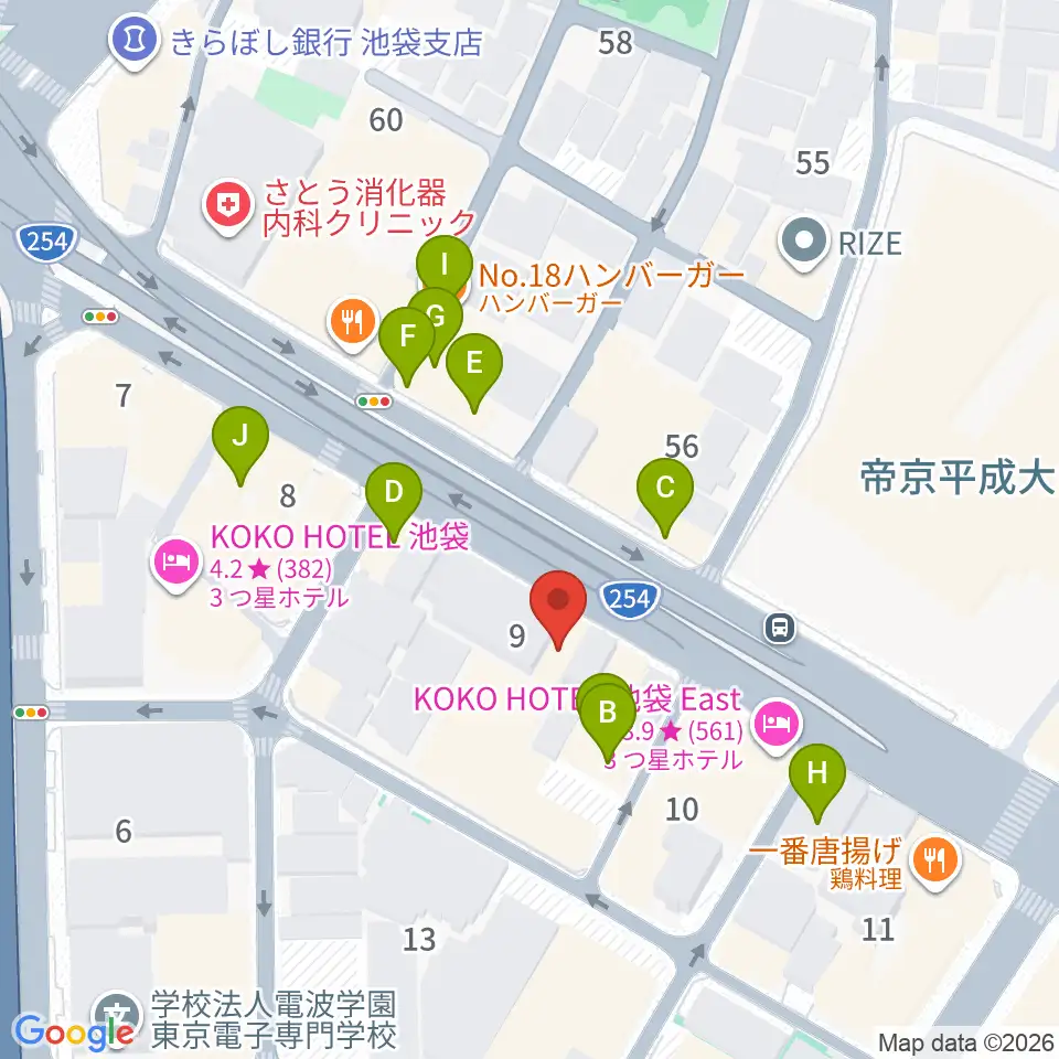 コアミュージックスクール 池袋校周辺のファミレス・ファーストフード一覧地図