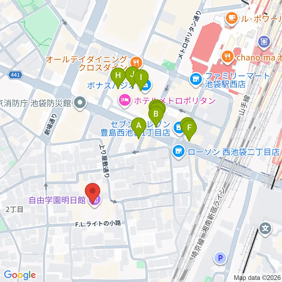 自由学園明日館周辺のファミレス・ファーストフード一覧地図