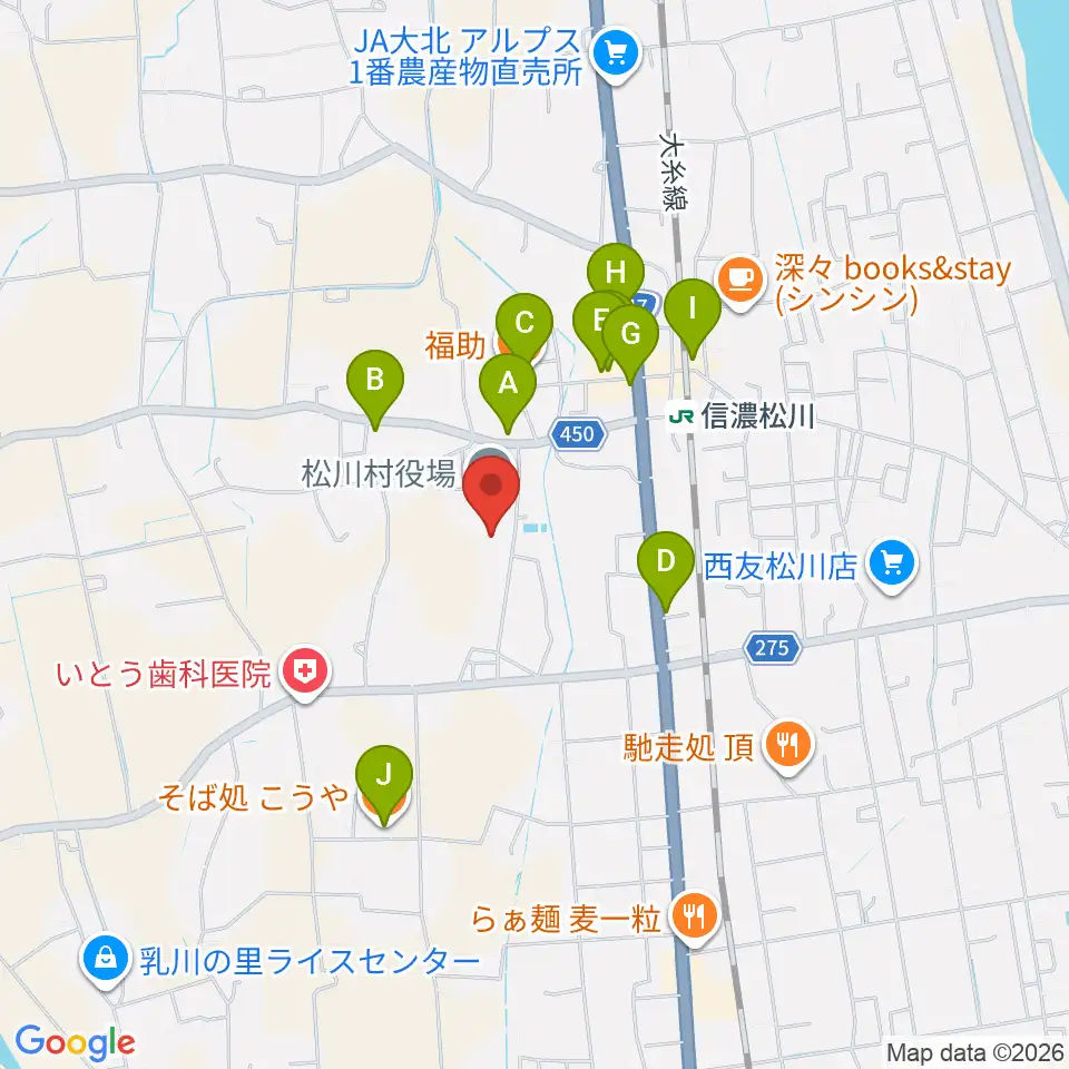 松川村多目的交流センターすずの音ホール周辺のファミレス・ファーストフード一覧地図