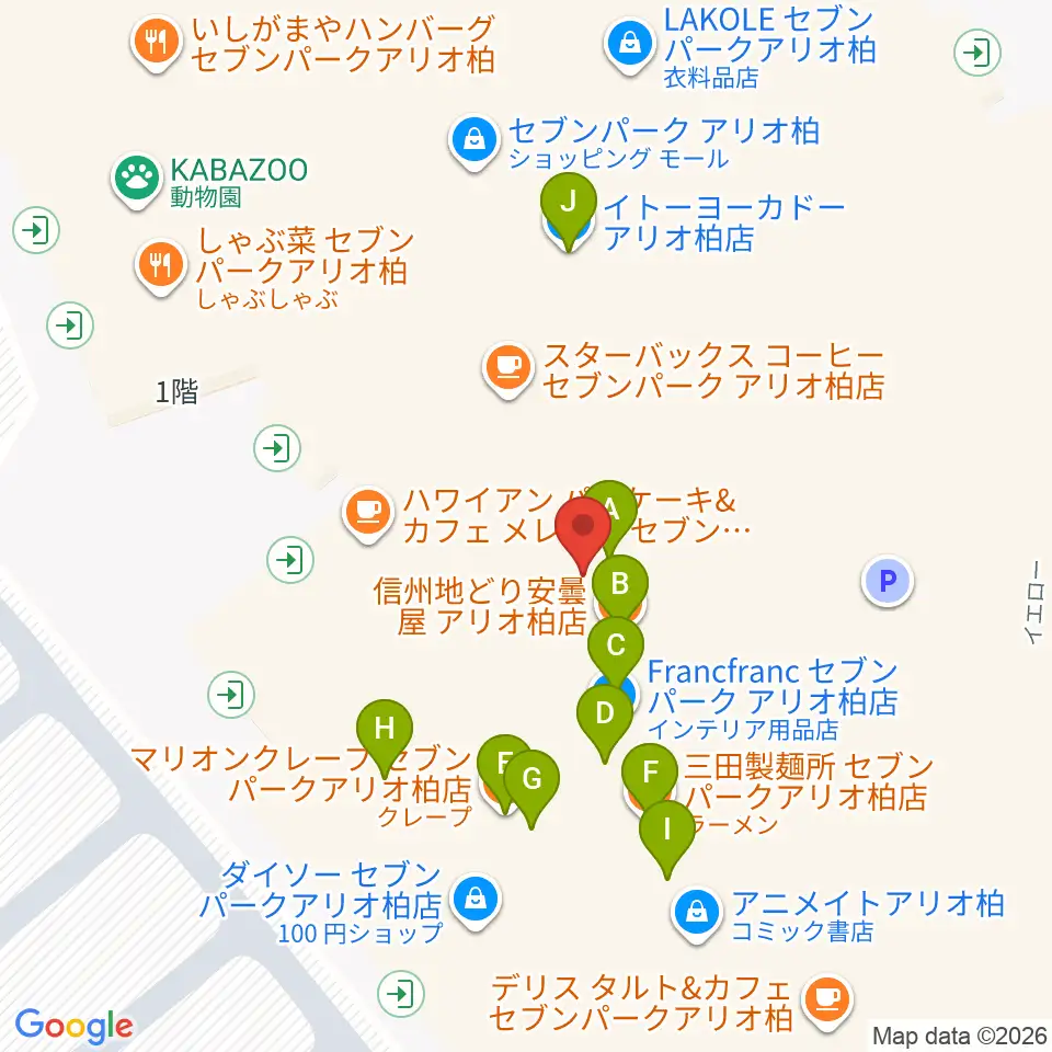 タワーレコードセブンパーク アリオ柏店周辺のファミレス・ファーストフード一覧地図
