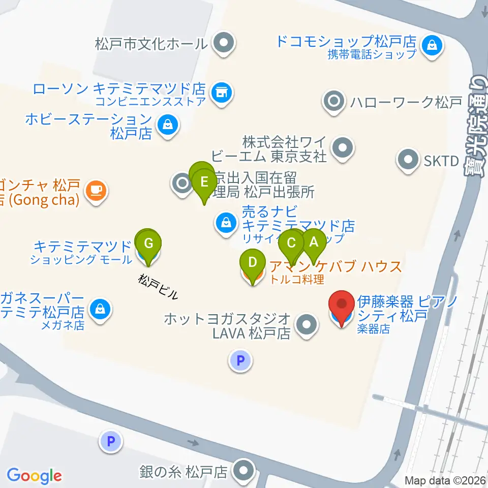 伊藤楽器ピアノシティ松戸周辺のファミレス・ファーストフード一覧地図