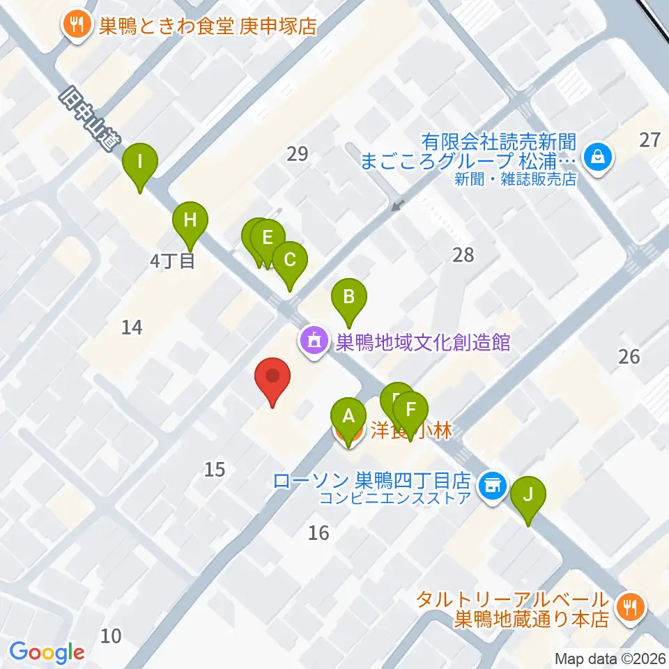 巣鴨地域文化創造館(中山道待夢)周辺のファミレス・ファーストフード一覧地図
