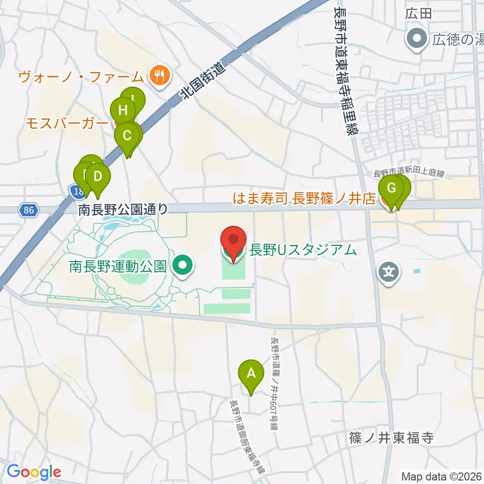 長野Uスタジアム周辺のファミレス・ファーストフード一覧地図