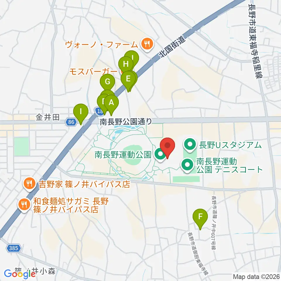南長野運動公園体育館周辺のファミレス・ファーストフード一覧地図