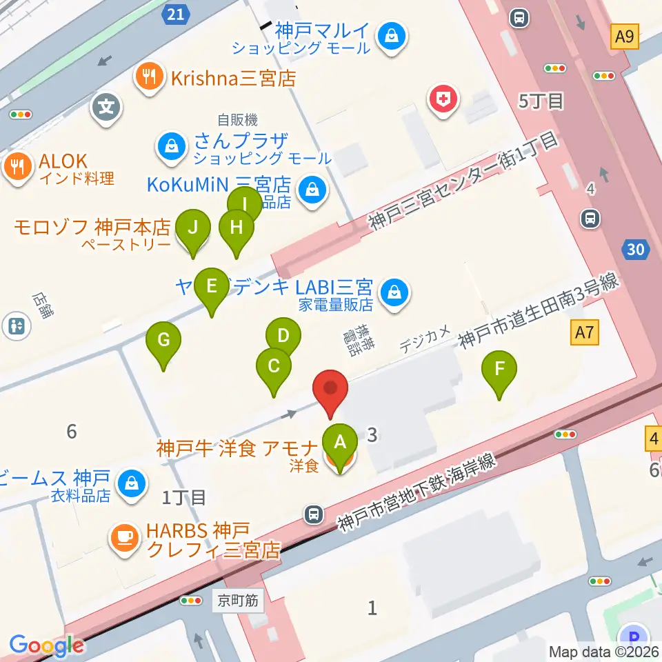 りずむぼっくす三宮店周辺のファミレス・ファーストフード一覧地図