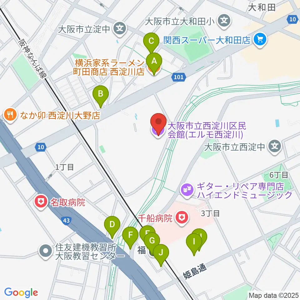 西淀川区民会館(エルモ西淀川)周辺のファミレス・ファーストフード一覧地図