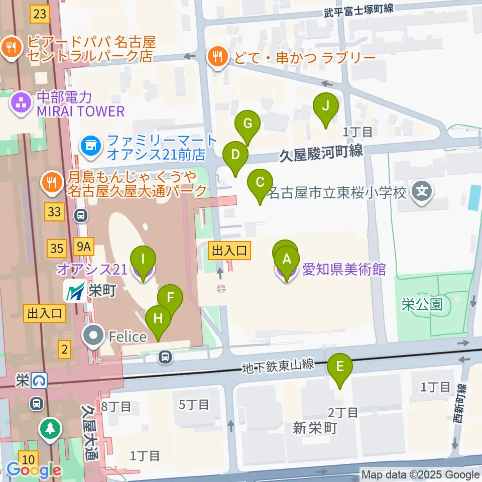 愛知県美術館周辺のファミレス・ファーストフード一覧地図