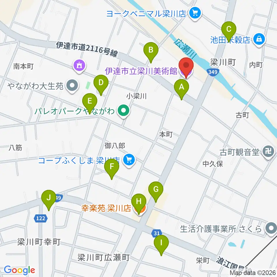 伊達市梁川美術館周辺のファミレス・ファーストフード一覧地図