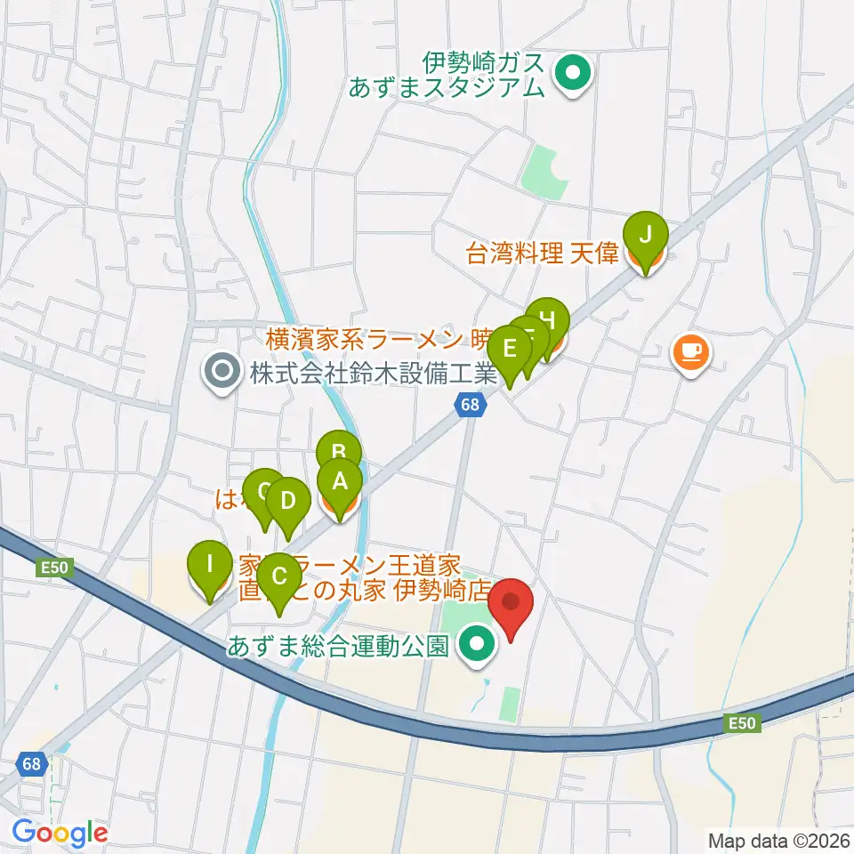 伊勢崎市あずまホール周辺のファミレス・ファーストフード一覧地図