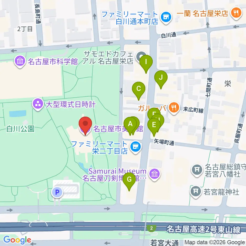 名古屋市美術館周辺のファミレス・ファーストフード一覧地図