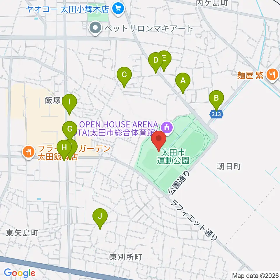 太田市運動公園野球場周辺のファミレス・ファーストフード一覧地図