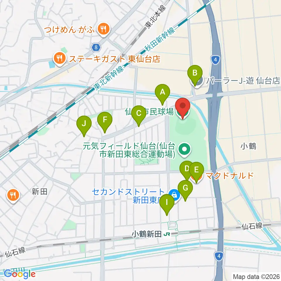 仙台市民球場周辺のファミレス・ファーストフード一覧地図