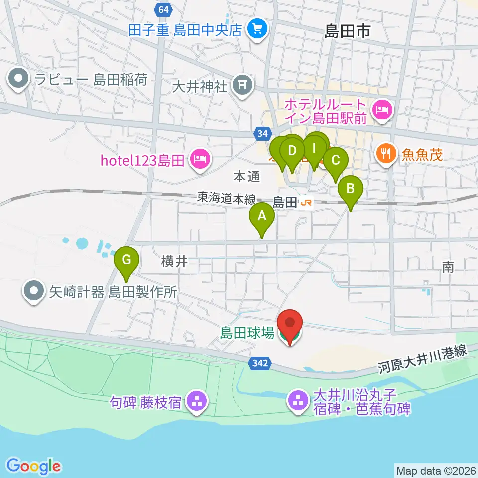 島田球場周辺のファミレス・ファーストフード一覧地図