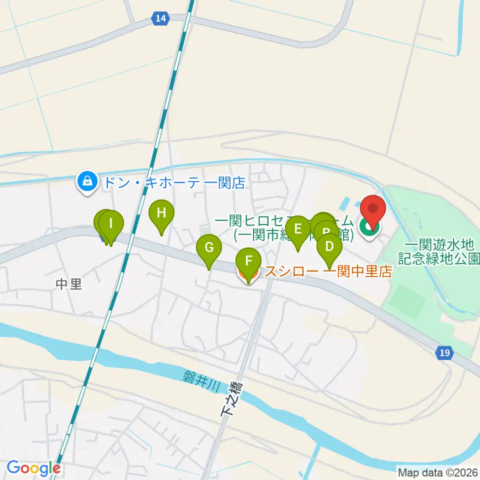 一関ヒロセユードーム周辺のファミレス・ファーストフード一覧地図