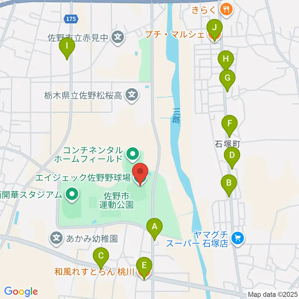 佐野エイジェック野球場周辺のファミレス・ファーストフード一覧地図
