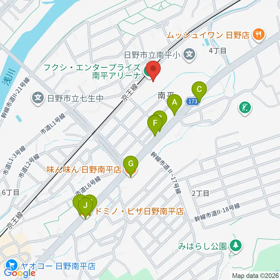 フクシ・エンタープライズ南平アリーナ周辺のファミレス・ファーストフード一覧地図