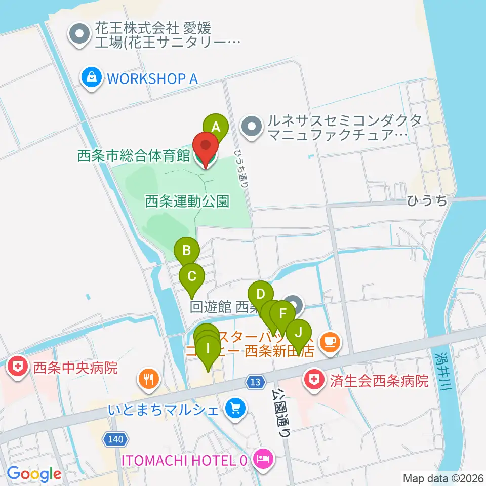 西条市総合体育館周辺のファミレス・ファーストフード一覧地図