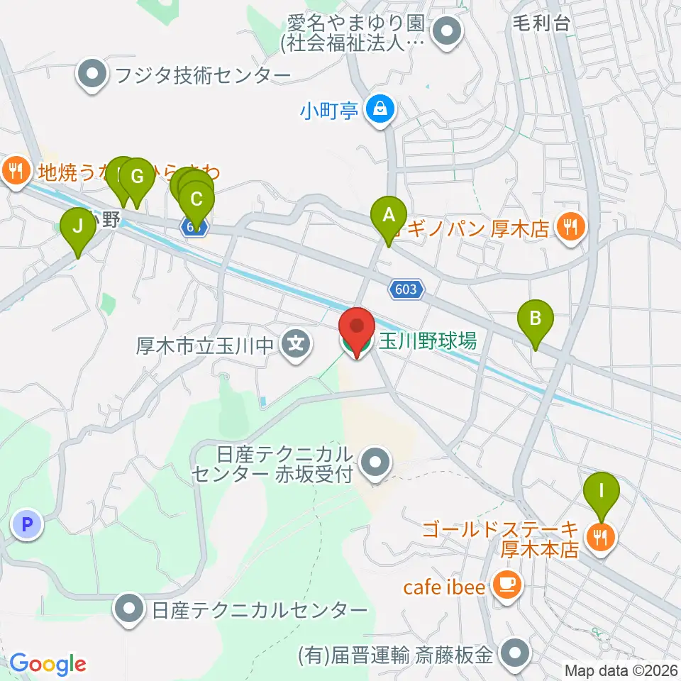 厚木市営玉川野球場周辺のファミレス・ファーストフード一覧地図