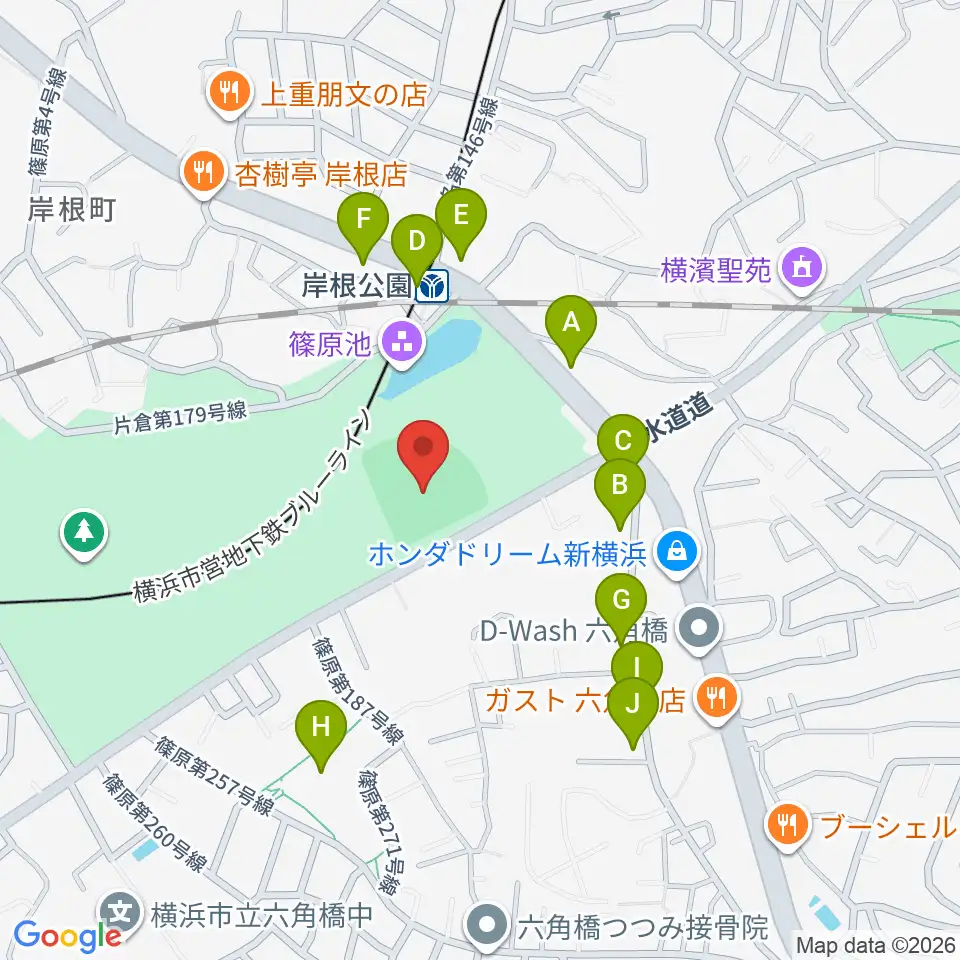 岸根公園野球場周辺のファミレス・ファーストフード一覧地図