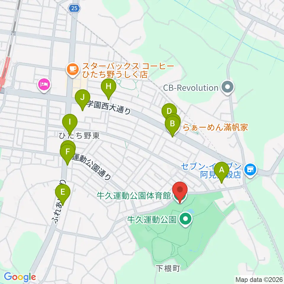 牛久運動公園体育館周辺のファミレス・ファーストフード一覧地図