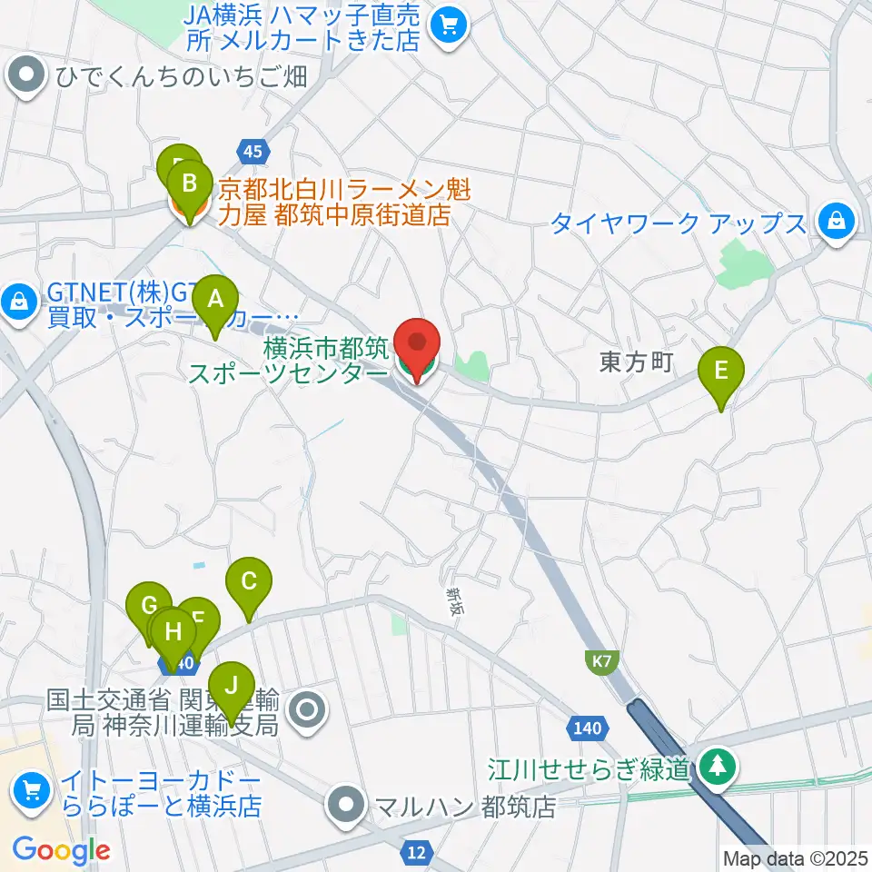 横浜市都筑スポーツセンター周辺のファミレス・ファーストフード一覧地図