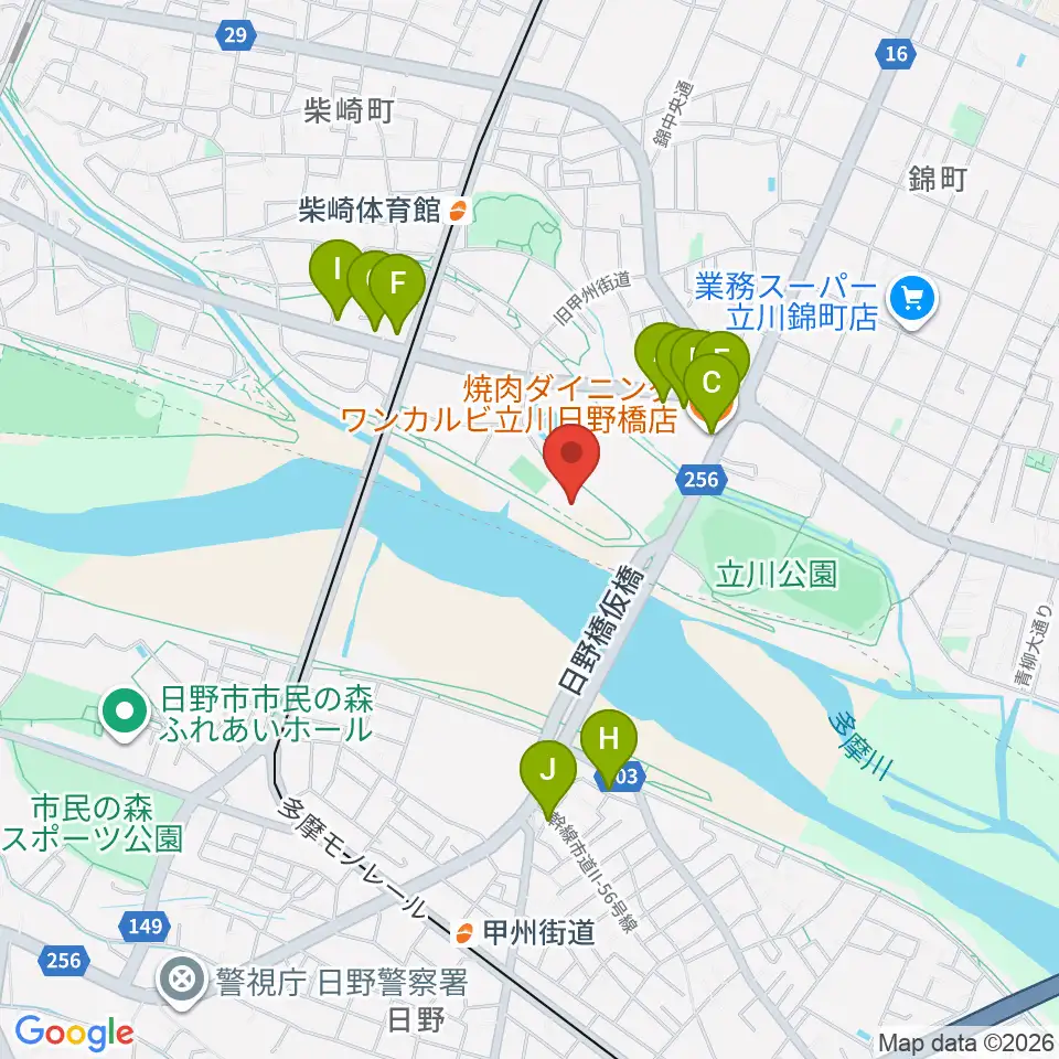立川公園新堤防運動広場周辺のファミレス・ファーストフード一覧地図