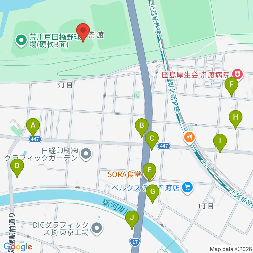 荒川戸田橋野球場周辺のファミレス・ファーストフード一覧地図