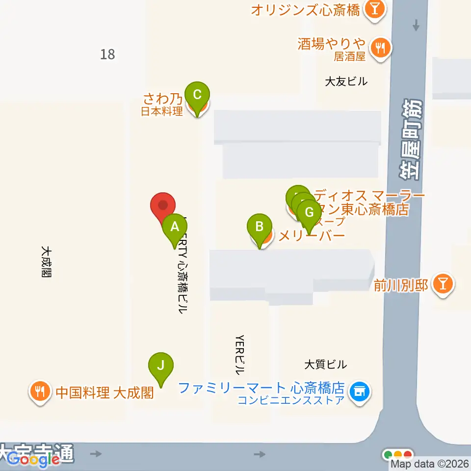 ベースオントップ東心斎橋店周辺のファミレス・ファーストフード一覧地図