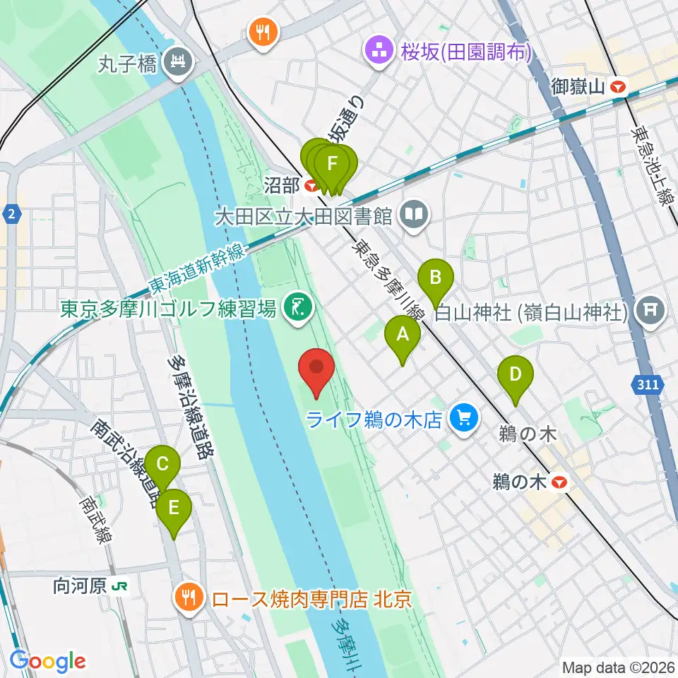 鵜の木緑地球技場周辺のファミレス・ファーストフード一覧地図