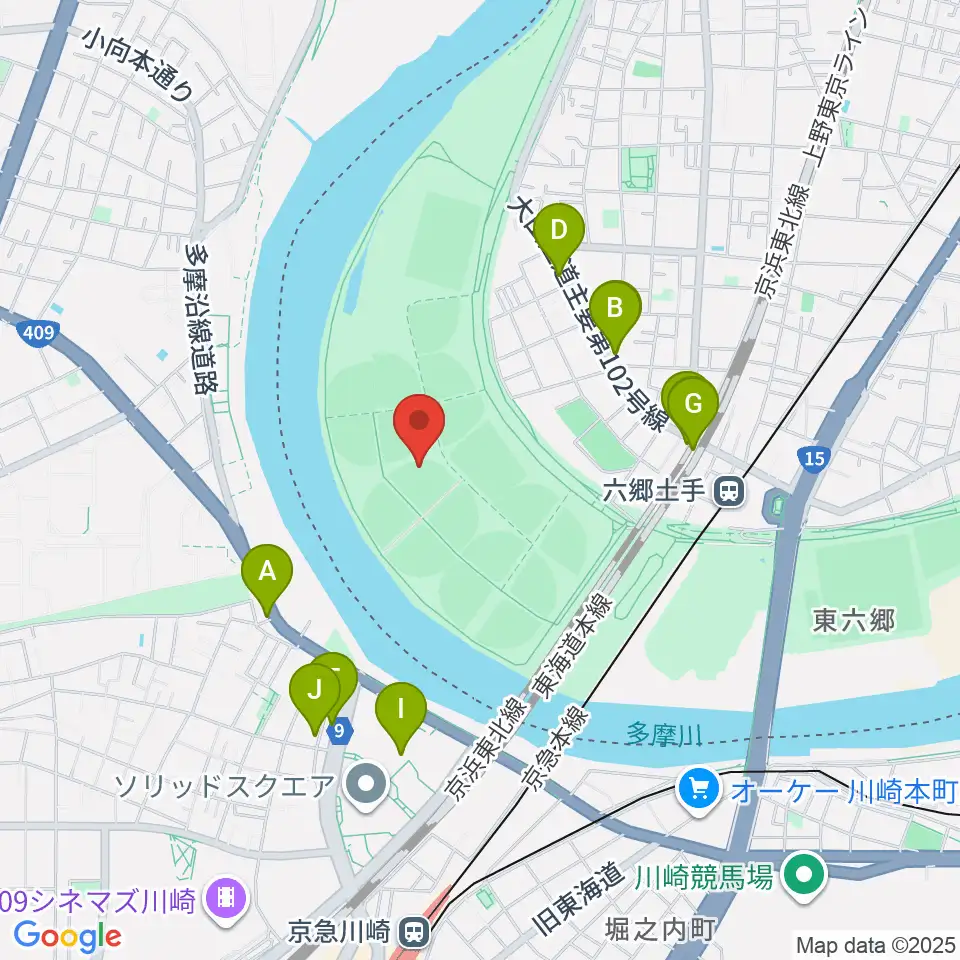 多摩川緑地野球場周辺のファミレス・ファーストフード一覧地図