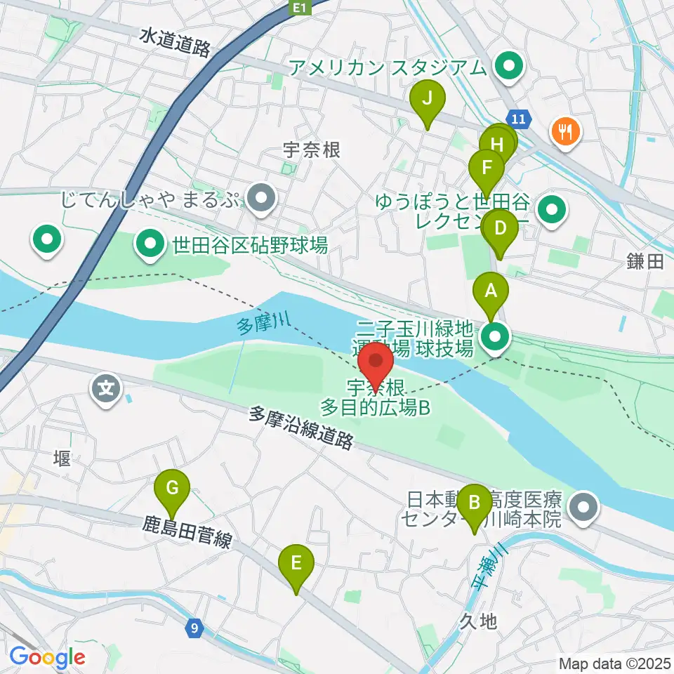 宇奈根多目的広場周辺のファミレス・ファーストフード一覧地図