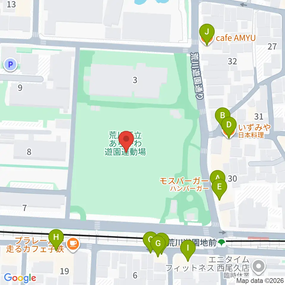 あらかわ遊園運動場周辺のファミレス・ファーストフード一覧地図