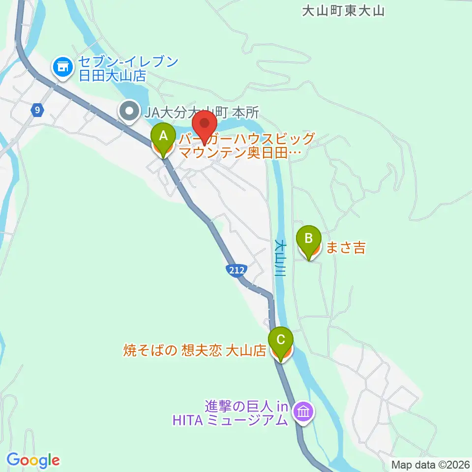 日田市大山文化センター周辺のファミレス・ファーストフード一覧地図