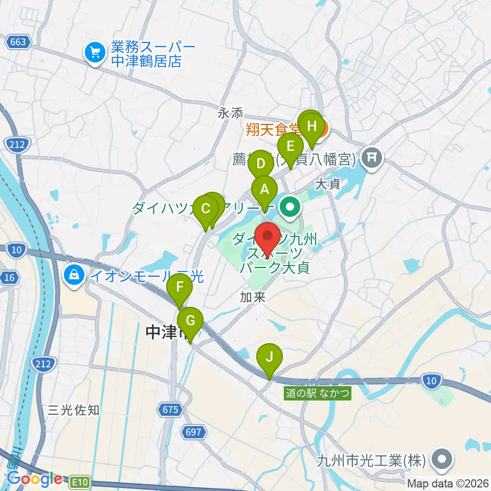 ダイハツ九州スタジアム周辺のファミレス・ファーストフード一覧地図