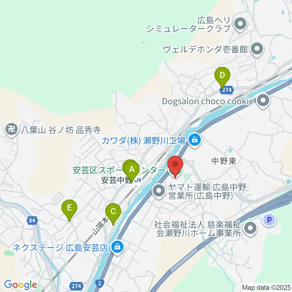 広島市安芸区スポーツセンター周辺のファミレス・ファーストフード一覧地図