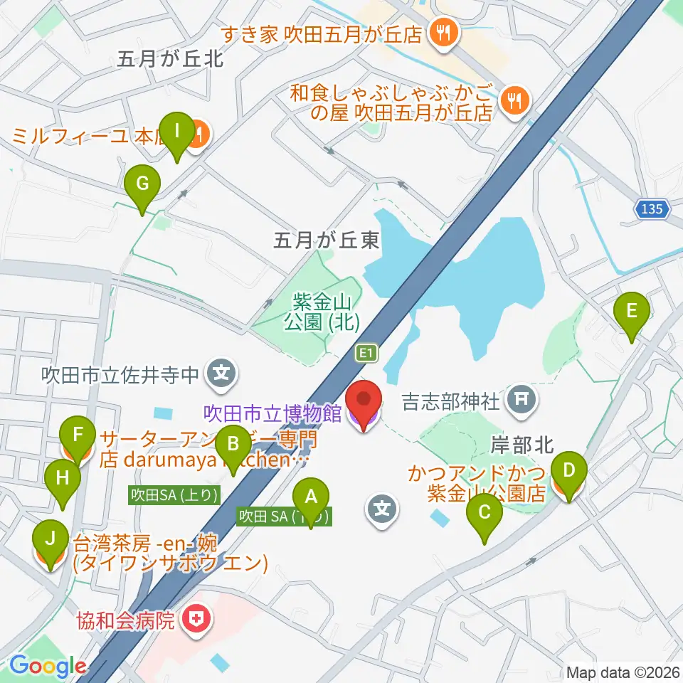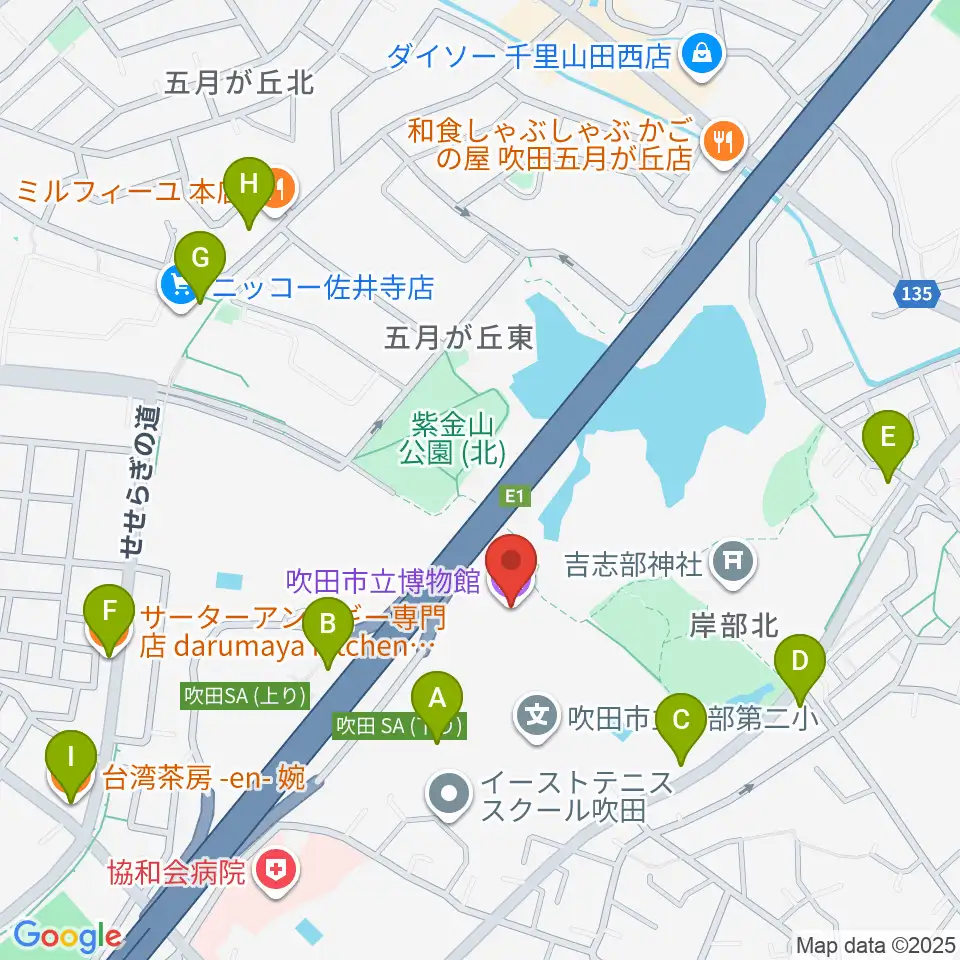 吹田市立博物館周辺のファミレス・ファーストフード一覧地図